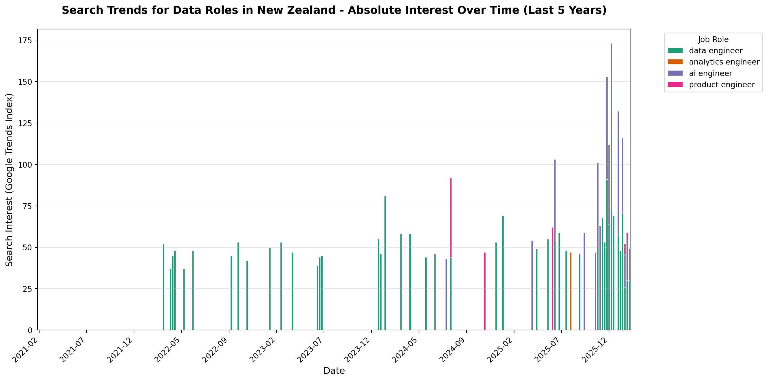 ax.set_title('Search Trends for Data Roles in New Zealand - Absolute Interest Over Time (Last 5 Years)',