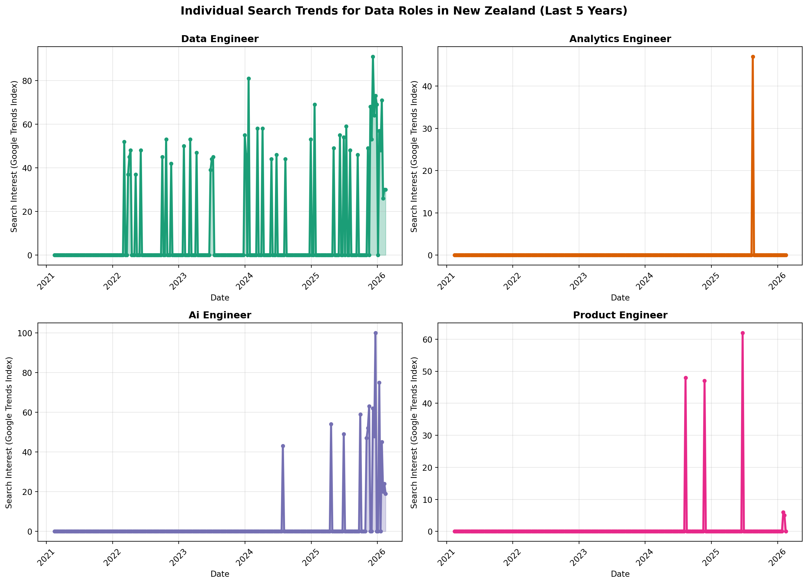 fig.suptitle('Individual Search Trends for Data Roles in New Zealand (Last 5 Years)',